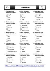 Quiz: Autumn (Mid-Level) Quiz DoAn — September 14, 2011 · Comments off [WpProQuiz 12] Click for a printable worksheet for this video quiz. Want to see more autumn videos? Click here. Also, try the Halloween quiz. Related posts: Quiz: Winter (Basic) Winter Olympics Video Dictionary Mid-Level Mix Quiz Quiz: Winter (Mid-Level) Quiz: Jobs (Mid-Level) Quiz: Places (Mid-Level) Transportation Quiz (mixed level) Quiz: Jobs (Basic-Level)